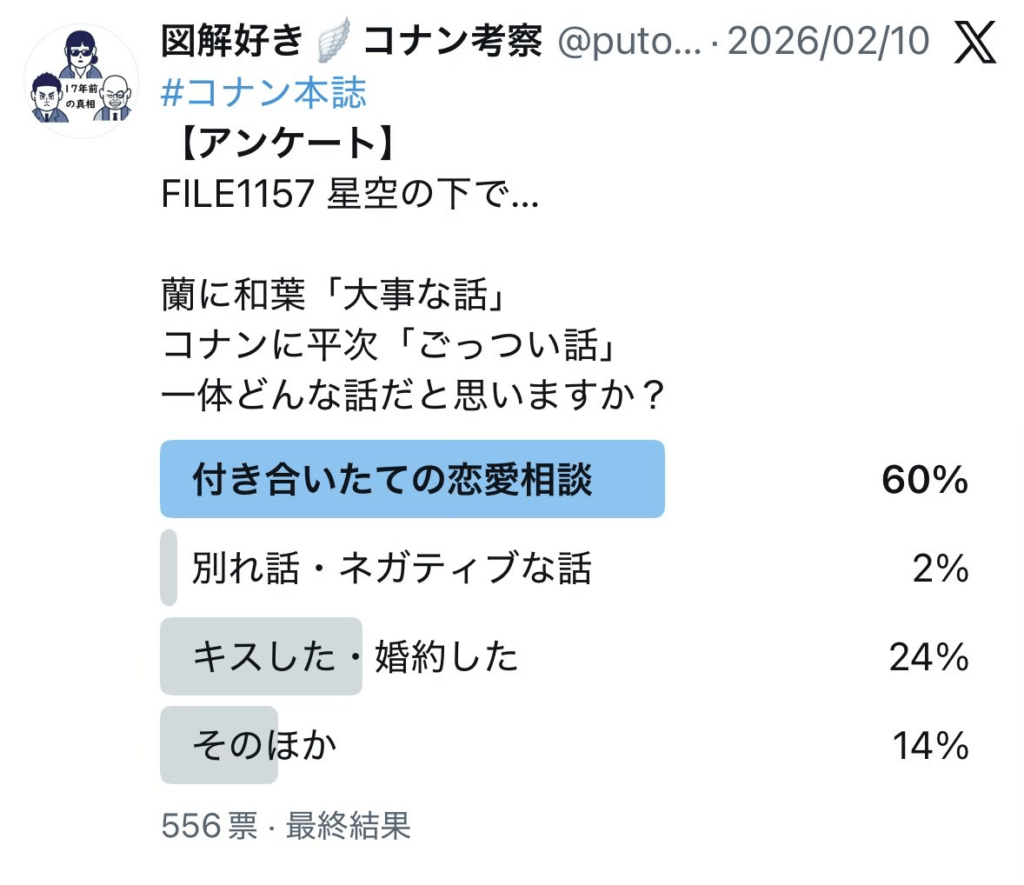前話FILE.1157後に筆者のXアカウントでおこなったアンケートでは、「ペアルック」が78%、「大事な話=付き合いたての恋愛相談」が60%の予想で優勢。和葉の「大事な話」と平次の「ごっつい話」は別の内容という予想もありました。