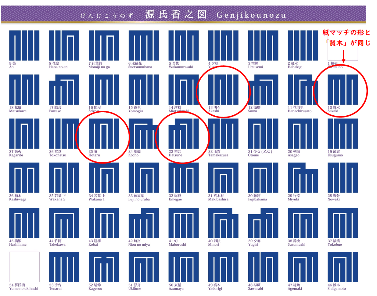 源氏香」というお香文様に当てはめると、1本切り取られた紙マッチの形は「賢木」と一致します。