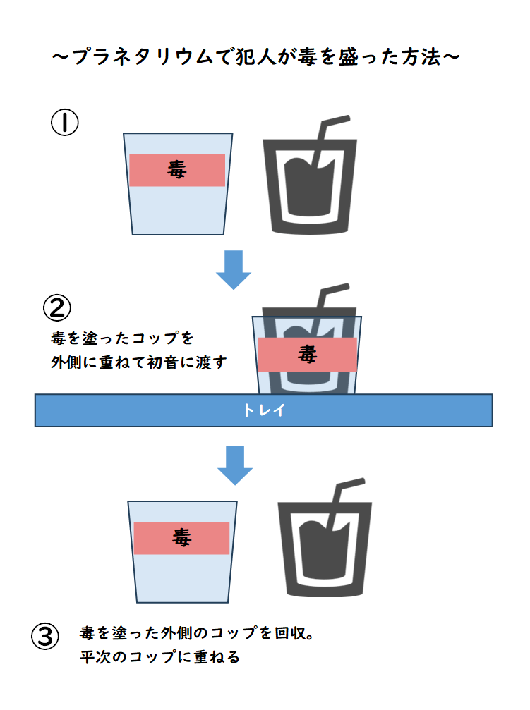 毒はコップの内側に塗って初音に渡す時に回収、もしくは初音に渡したコップの外側に塗って回し飲みなどしてるときにコップを回収。の2パターンが考えられます。